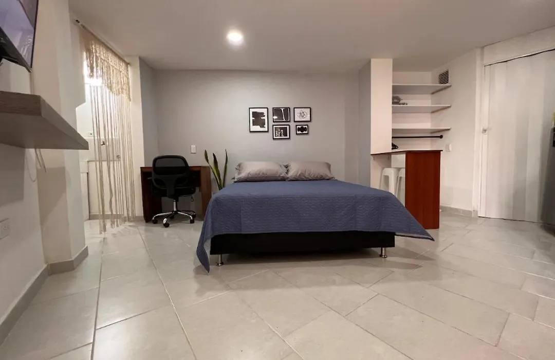 麦德林Comfy loft in Laureles公寓设有大厨房和配办公桌,电视 和卫星频道平板电视的客房. 从公寓出发很容易抵达麦德林,仅有2.6公里距离.住所距离奥拉亚-埃雷拉机场有不到10分钟的车程.